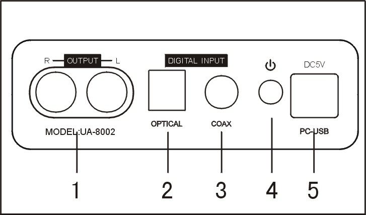 (3)音频输入选择:开关向下为PC-USB输入,作为声卡使用;开关向上为同轴/光纤数字音频输入。